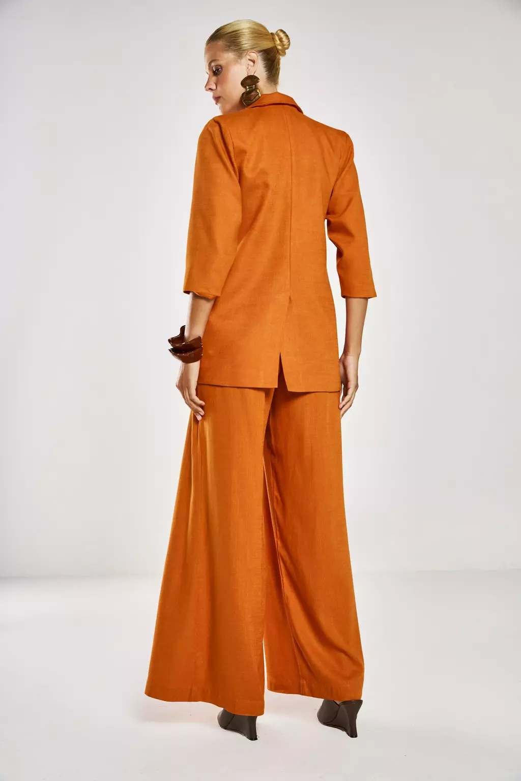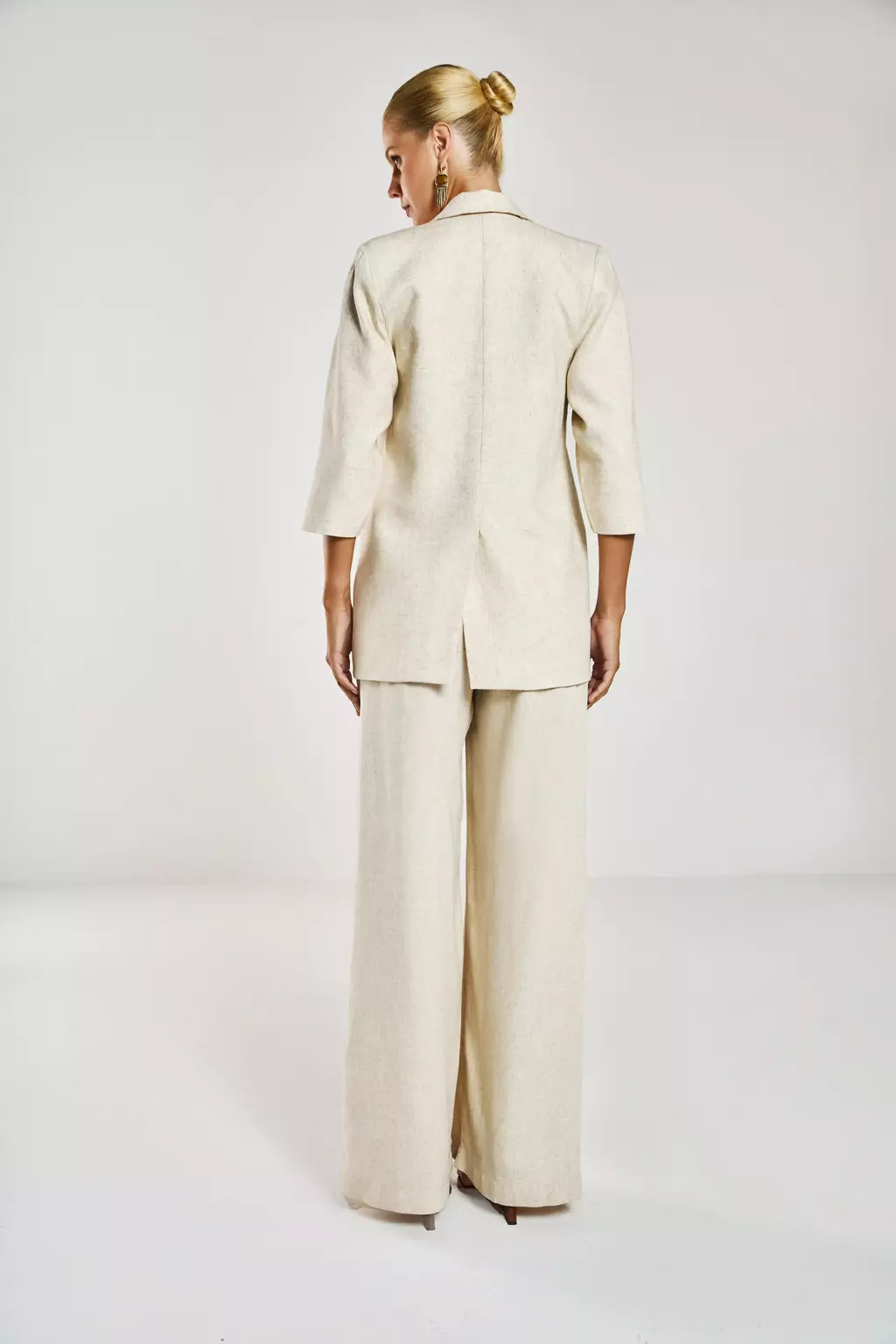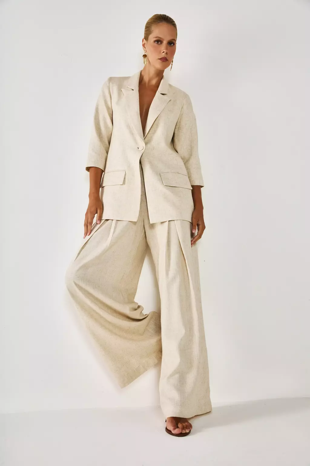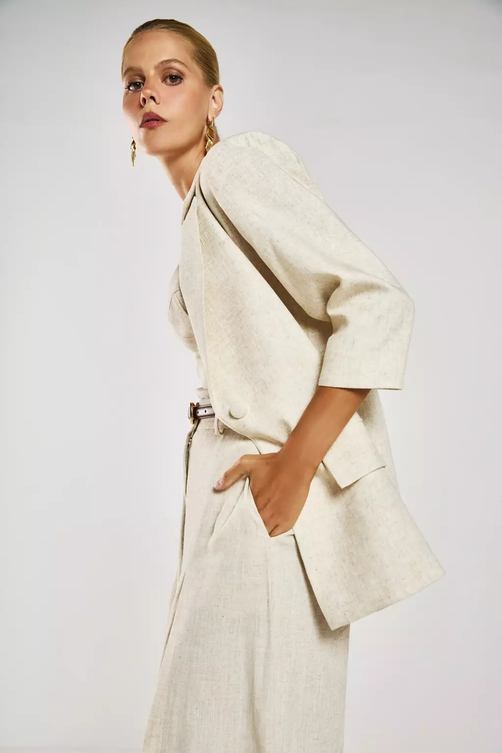 O Blazer Daniela é a terceira peça essencial para um visual sofisticado e atemporal. Com um design de alfaiataria em shape reto e comprimento médio, ele foi pensado para conferir um visual estruturado sem marcar excessivamente a cintura. A gola inglesa tradicional com lapelas simétricas e o abotoamento único com botão forrado adicionam um toque clássico e elegante.