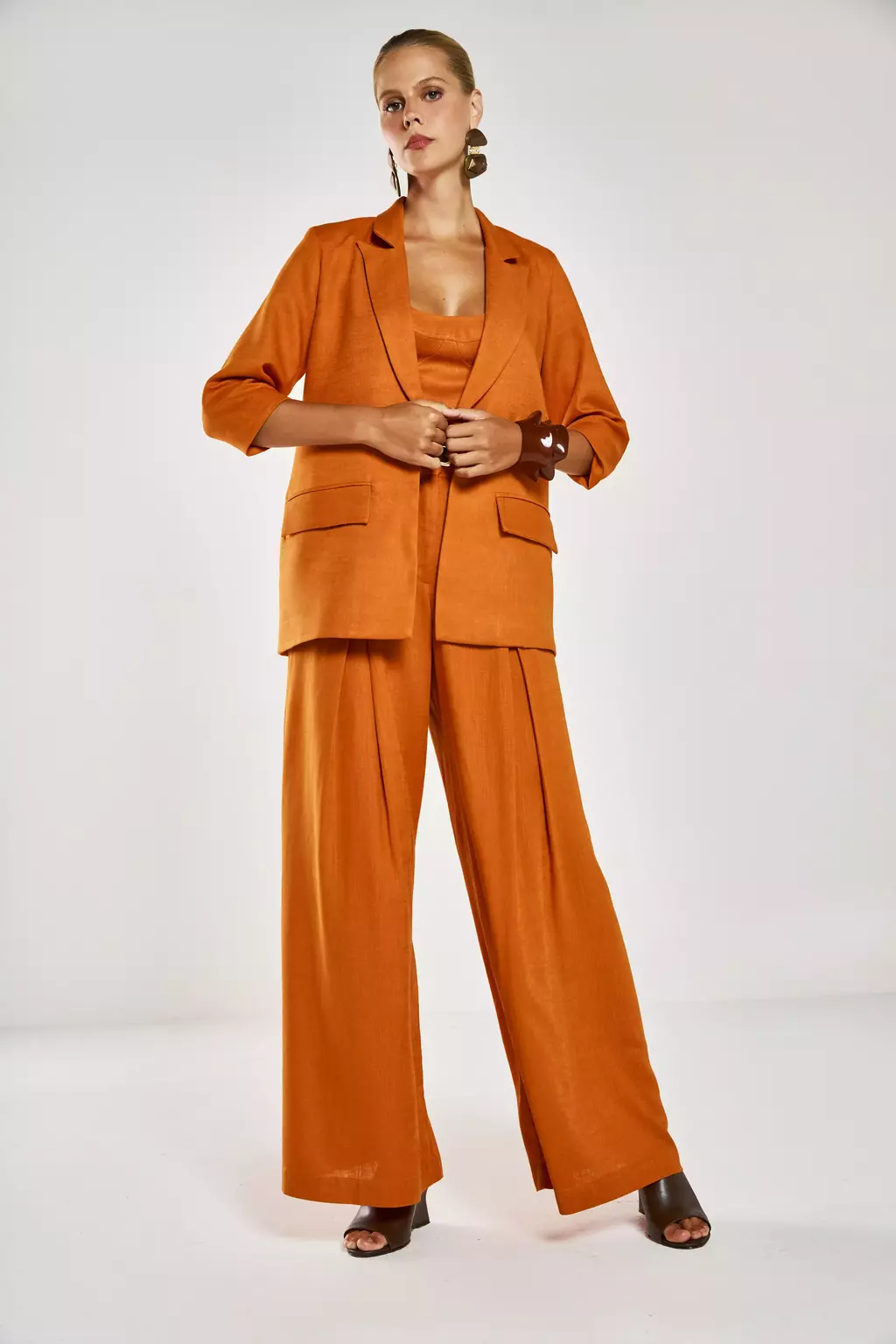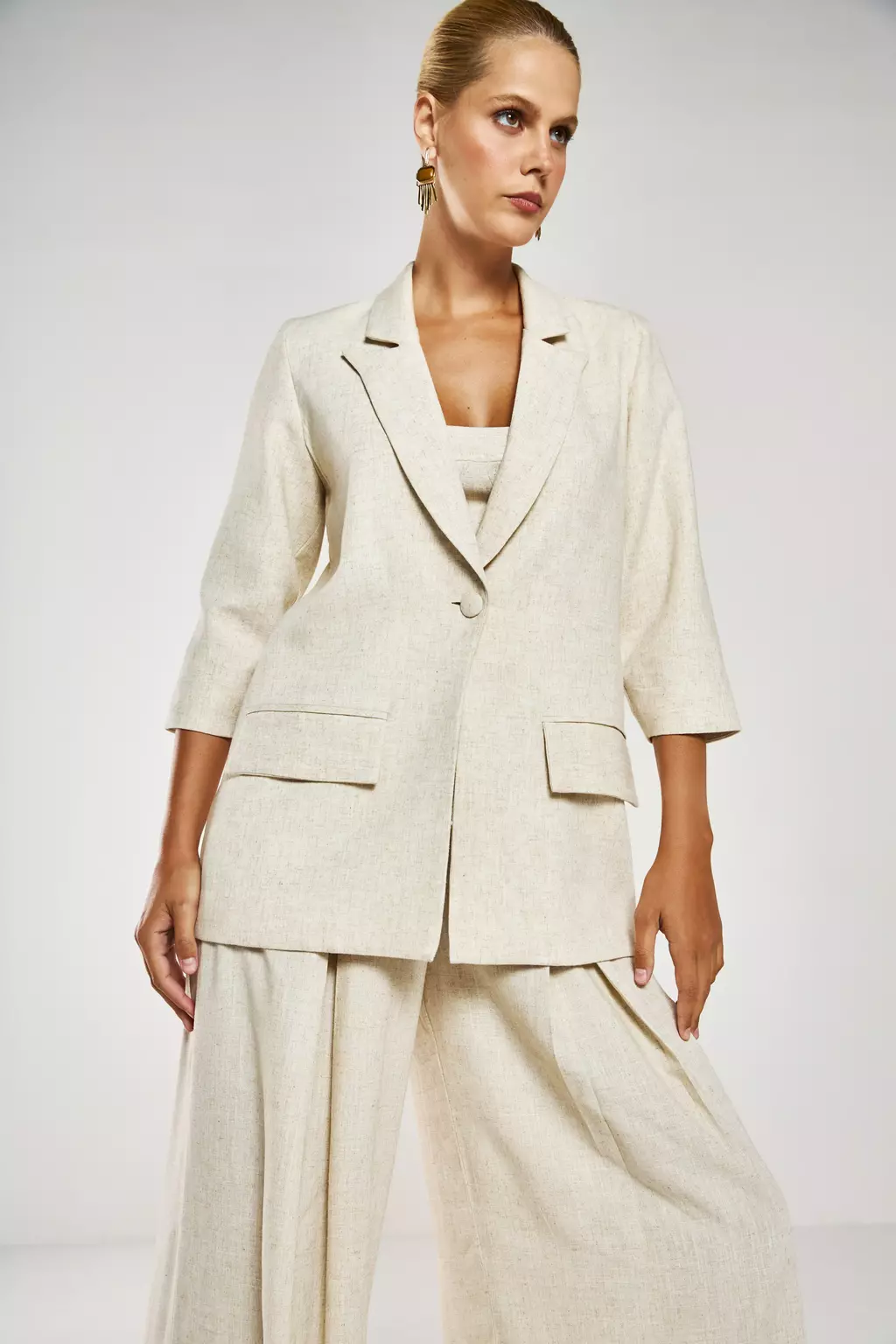 Modelagem: Blazer de alfaiataria, shape reto e comprimento médio.