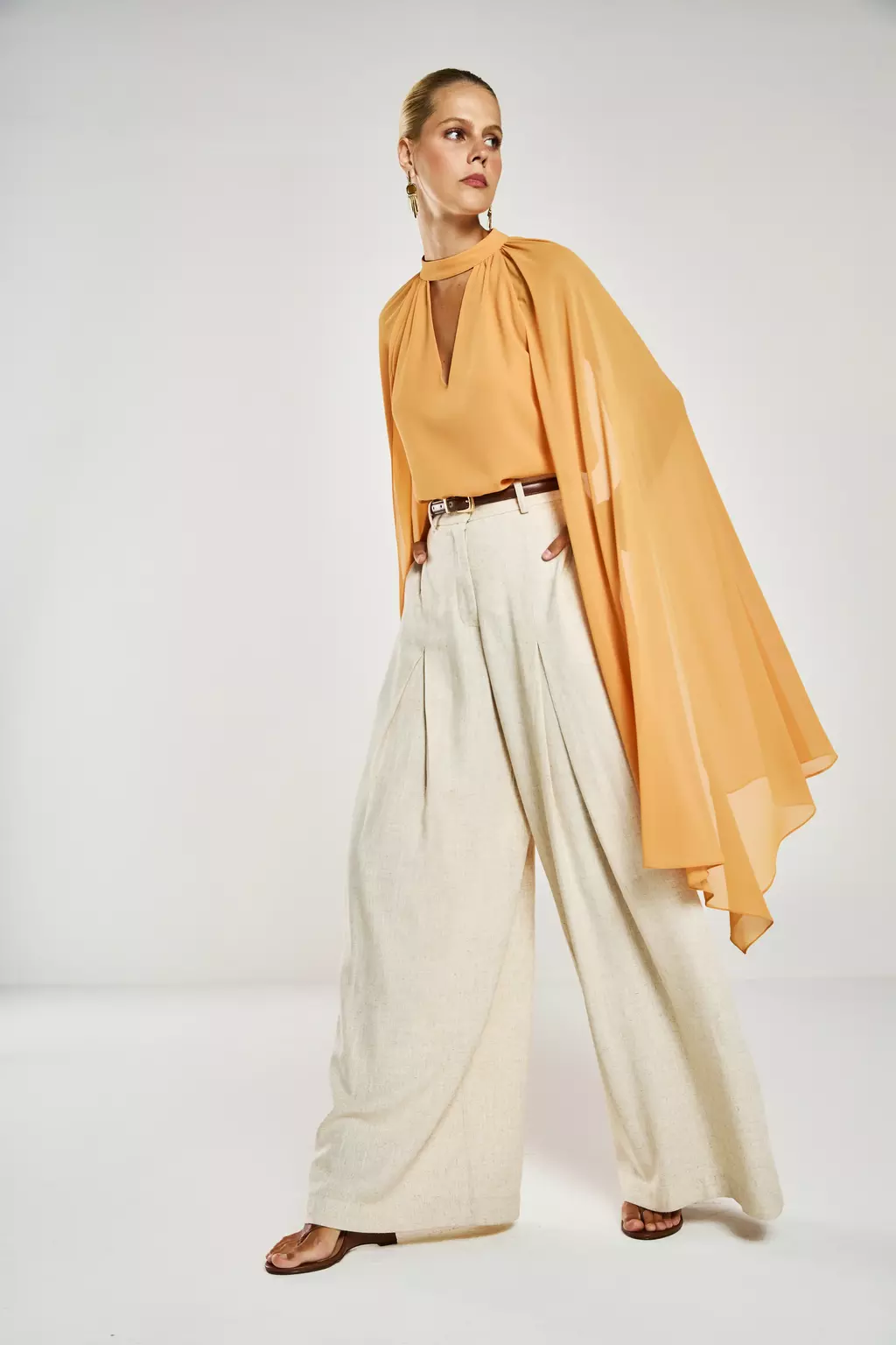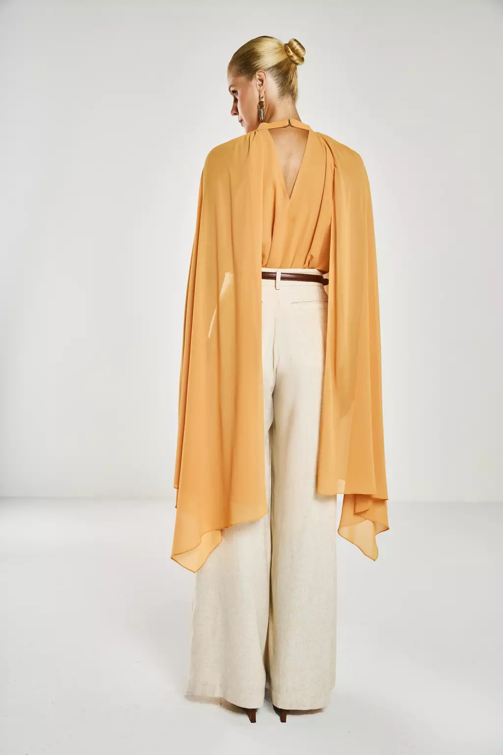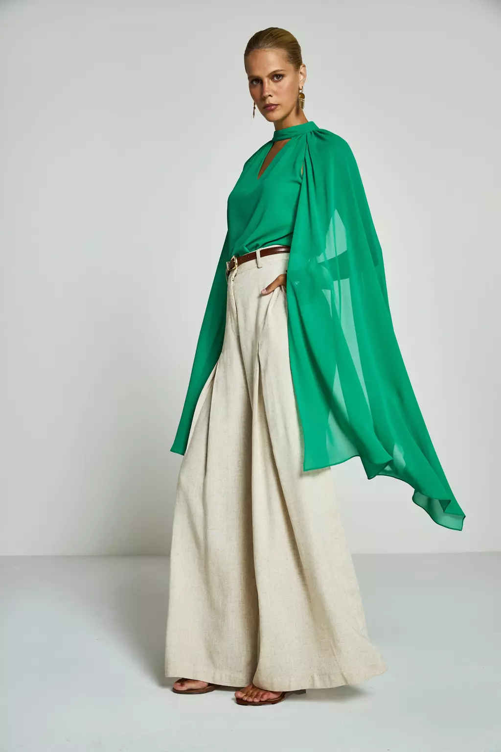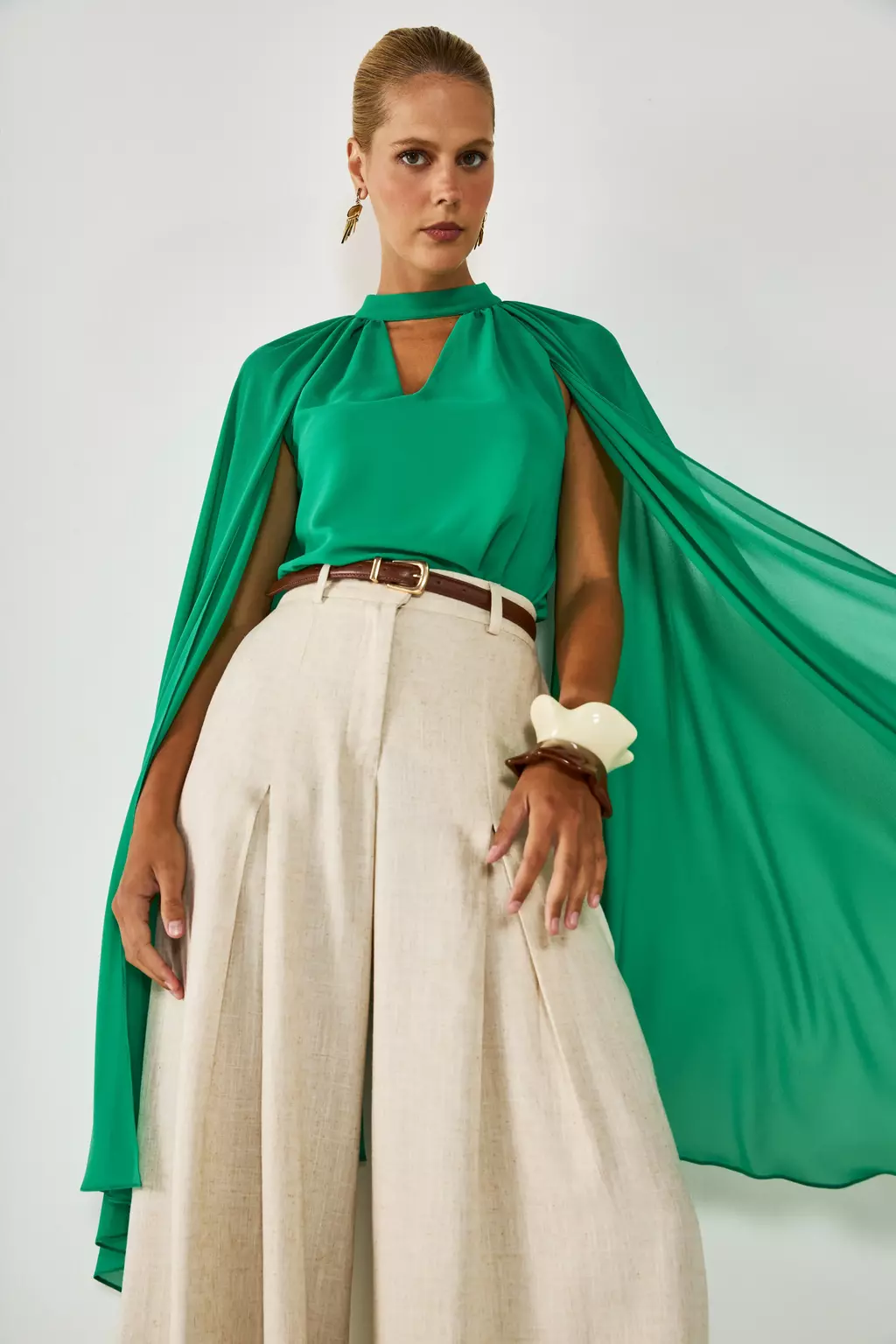 A Blusa Bia é a peça que define a elegância e o movimento com seu design dramático e fluido. Confeccionada em twist chiffon, um tecido extremamente leve e com caimento impecável, ela possui mangas sino longas (chegando à altura do joelho) e recorte raglan, criando um visual escultural. O colarinho transpassado forma um decote V na frente e nas costas, com franzidos estratégicos que adicionam volume e textura à peça.