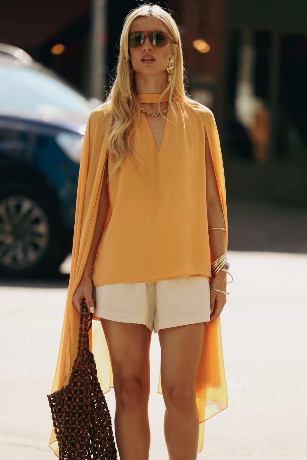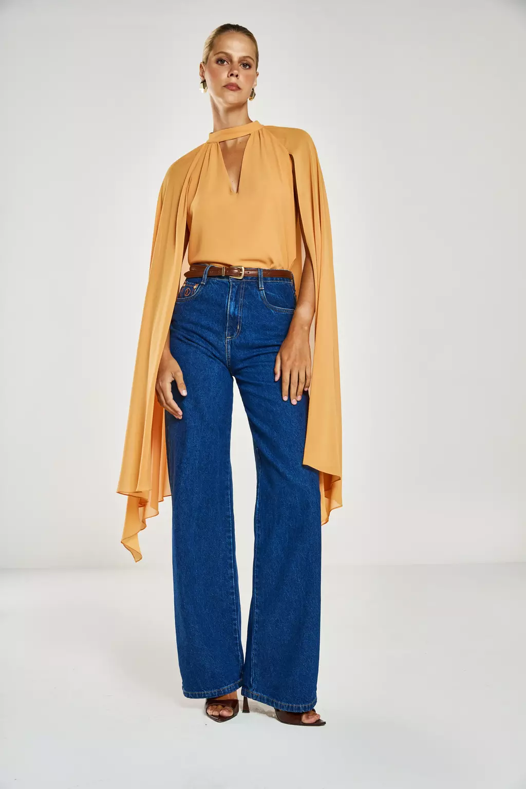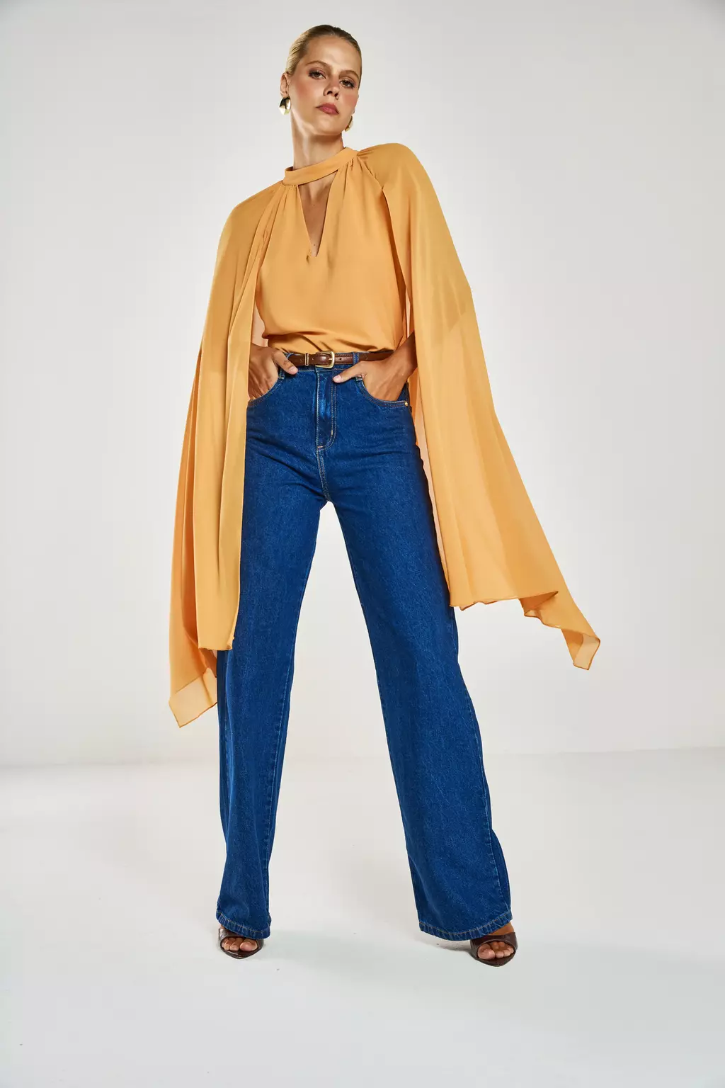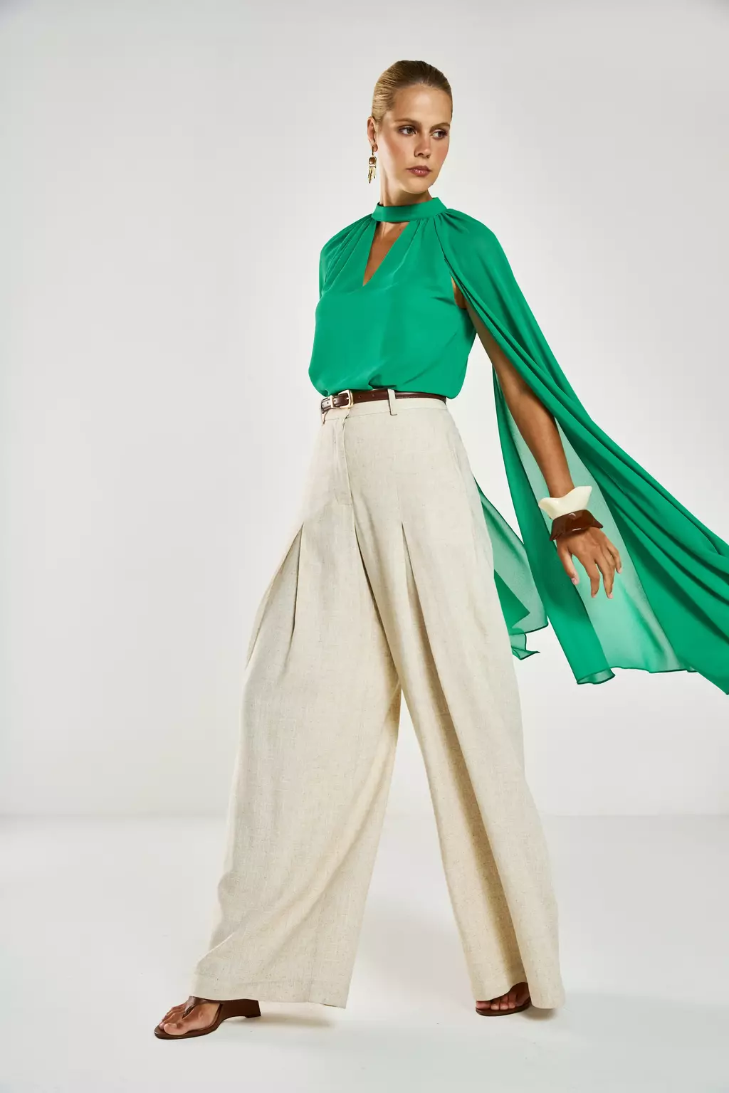 A Blusa Bia é a peça que define a elegância e o movimento com seu design dramático e fluido. Confeccionada em twist chiffon, um tecido extremamente leve e com caimento impecável, ela possui mangas sino longas (chegando à altura do joelho) e recorte raglan, criando um visual escultural. O colarinho transpassado forma um decote V na frente e nas costas, com franzidos estratégicos que adicionam volume e textura à peça.