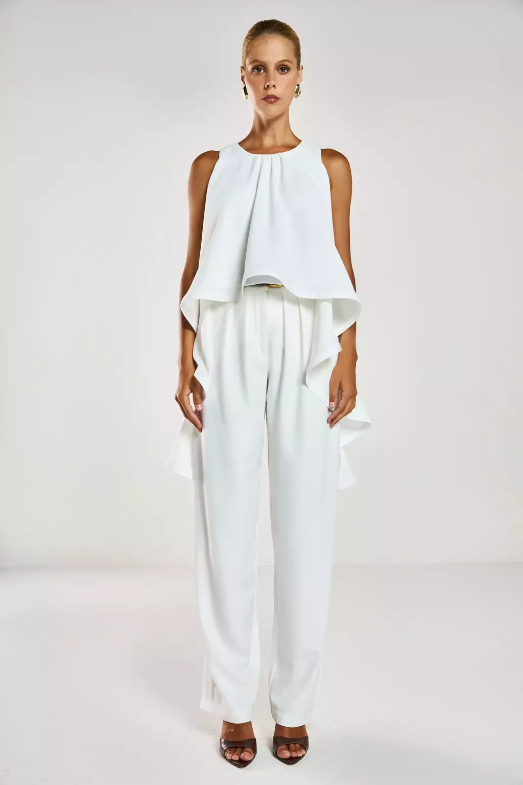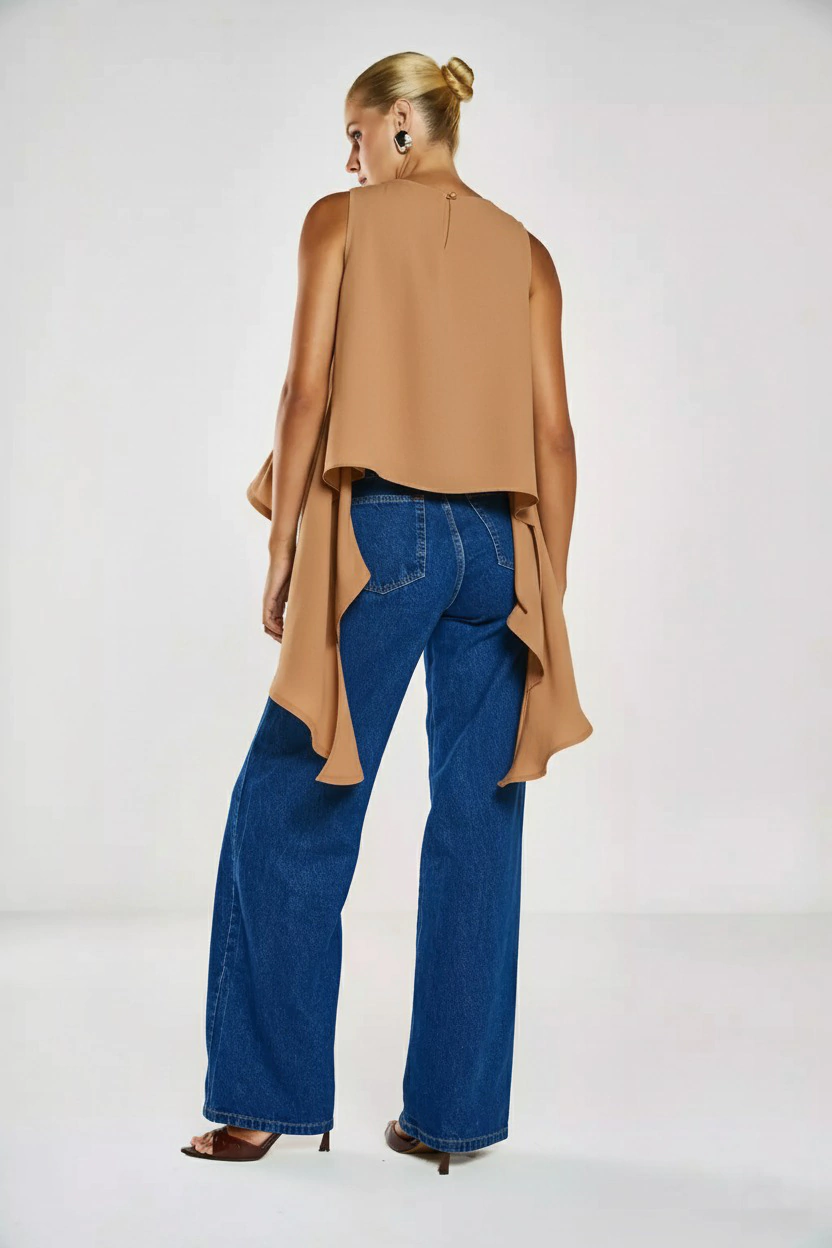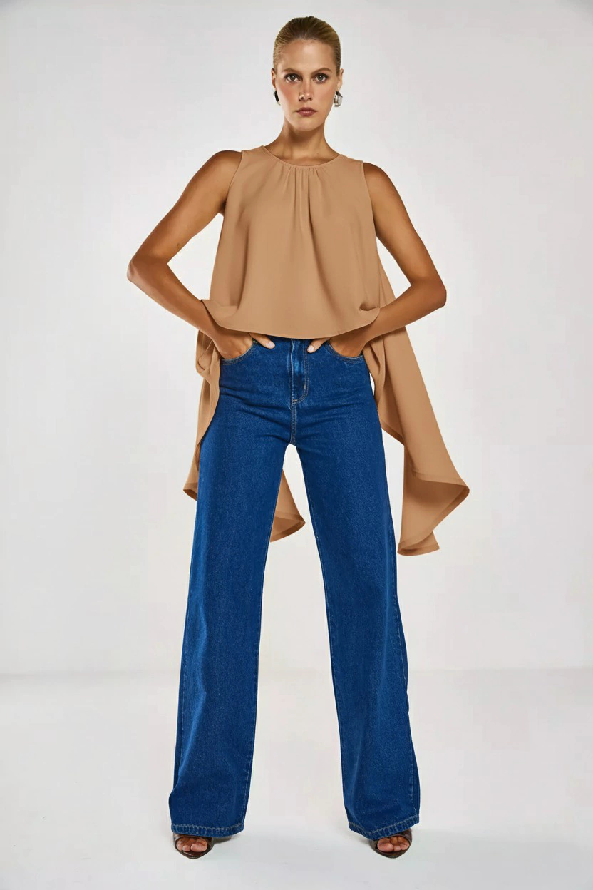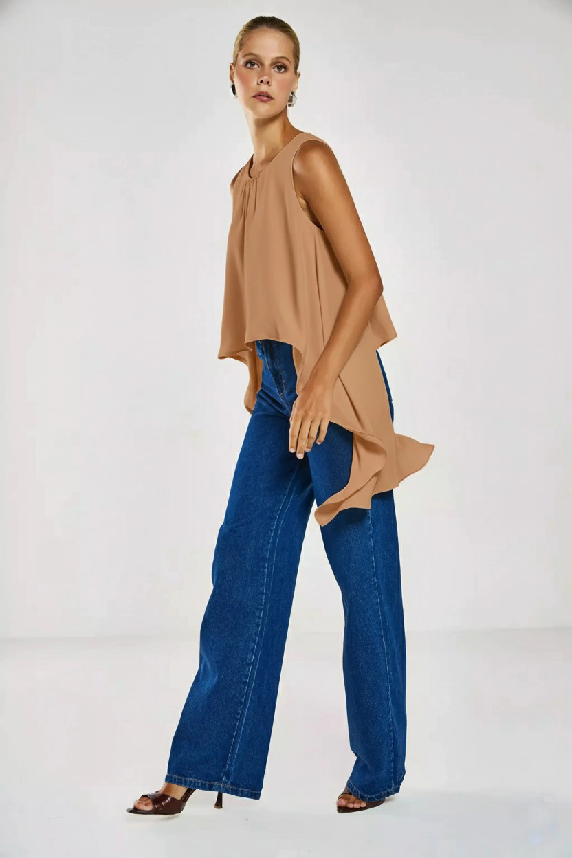 A Blusa Valentina é a definição de fluidez e movimento. Confeccionada em crepe bruxelas, um tecido com caimento leve e elegante, sua modelagem solta tipo trapézio proporciona um visual sofisticado e confortável. As pontas assimétricas nas laterais, com a barra em crinol, criam um efeito ondulado e dramático que se move com cada passo.