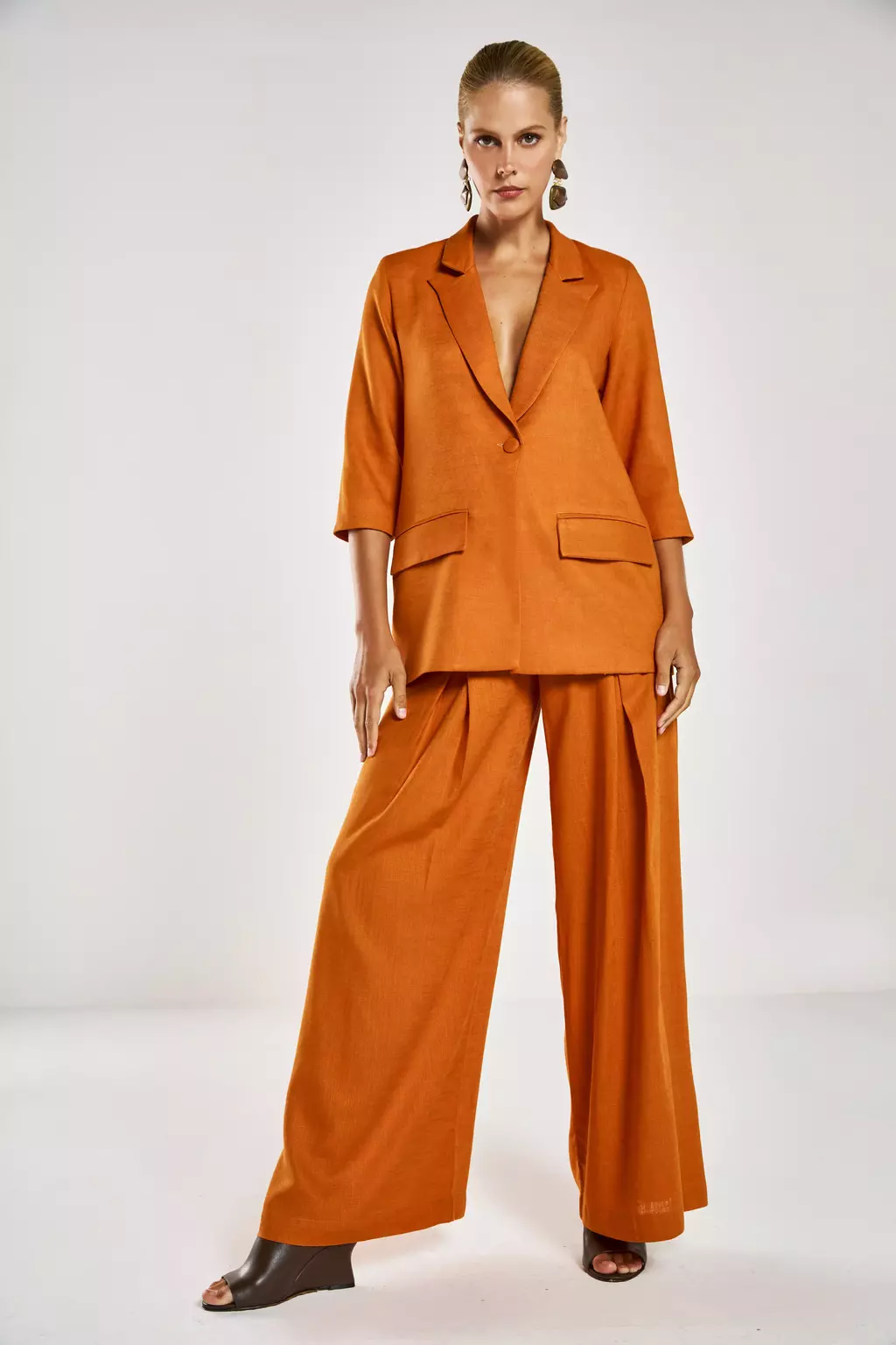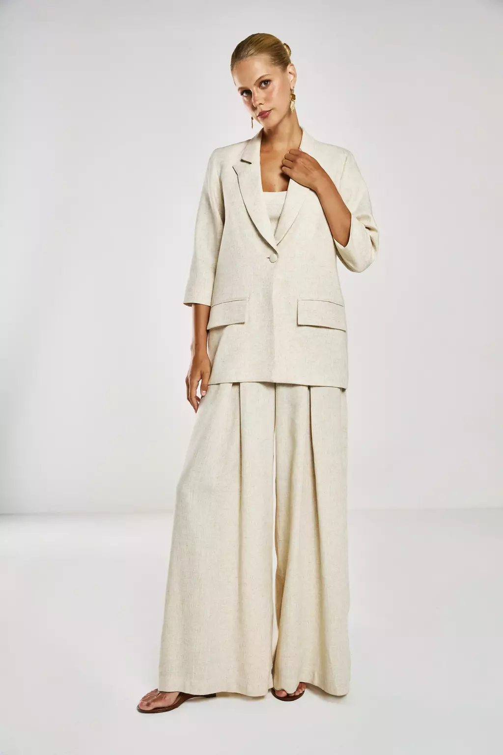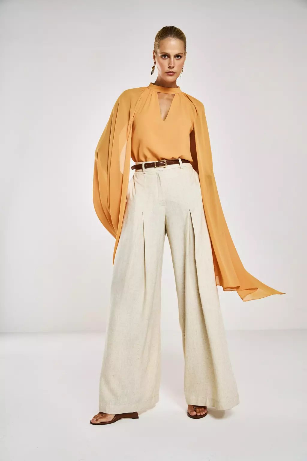 Modelagem: Pantalona de alfaiataria, perna ampla, cintura alta.