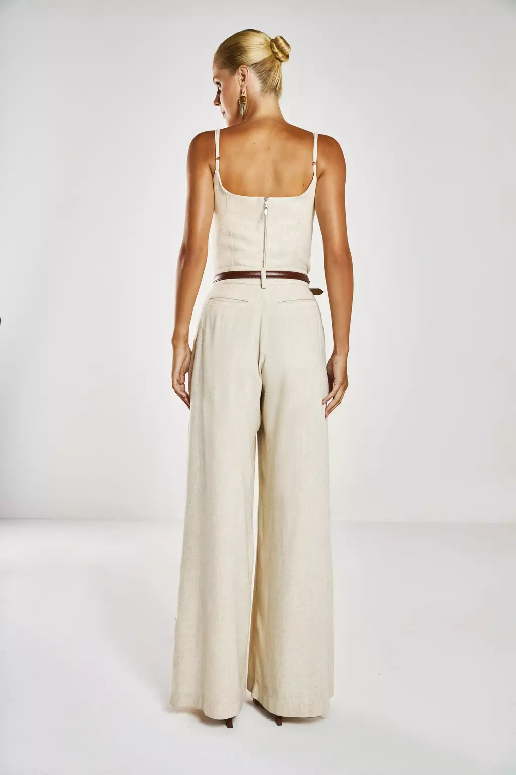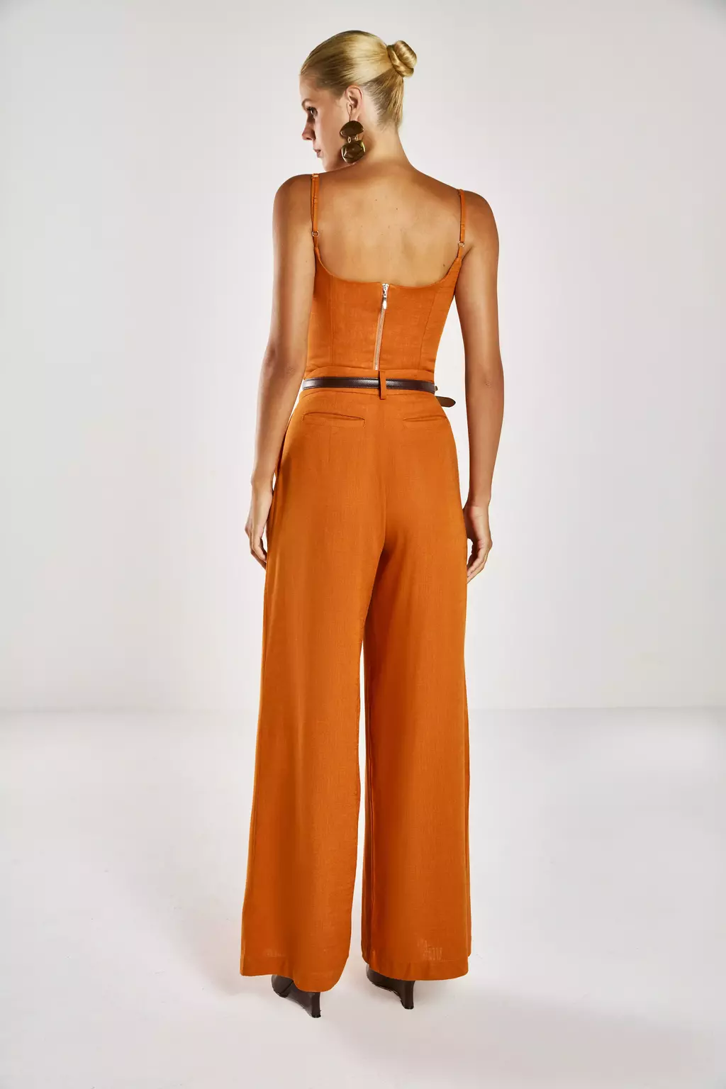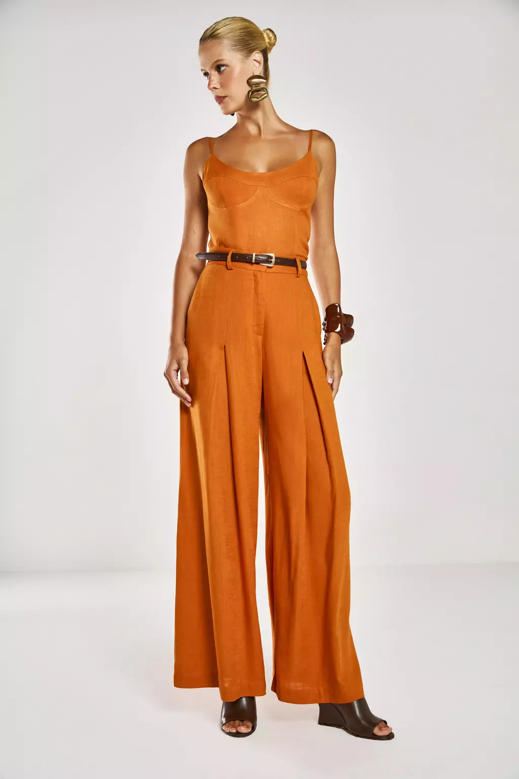 A Calça Isa é a peça de alfaiataria que combina sofisticação e conforto. Com cintura alta e perna ampla, ela possui um caimento fluido e elegante que alonga a silhueta. As pregas frontais adicionam um toque de refinamento e movimento, garantindo um visual impecável.