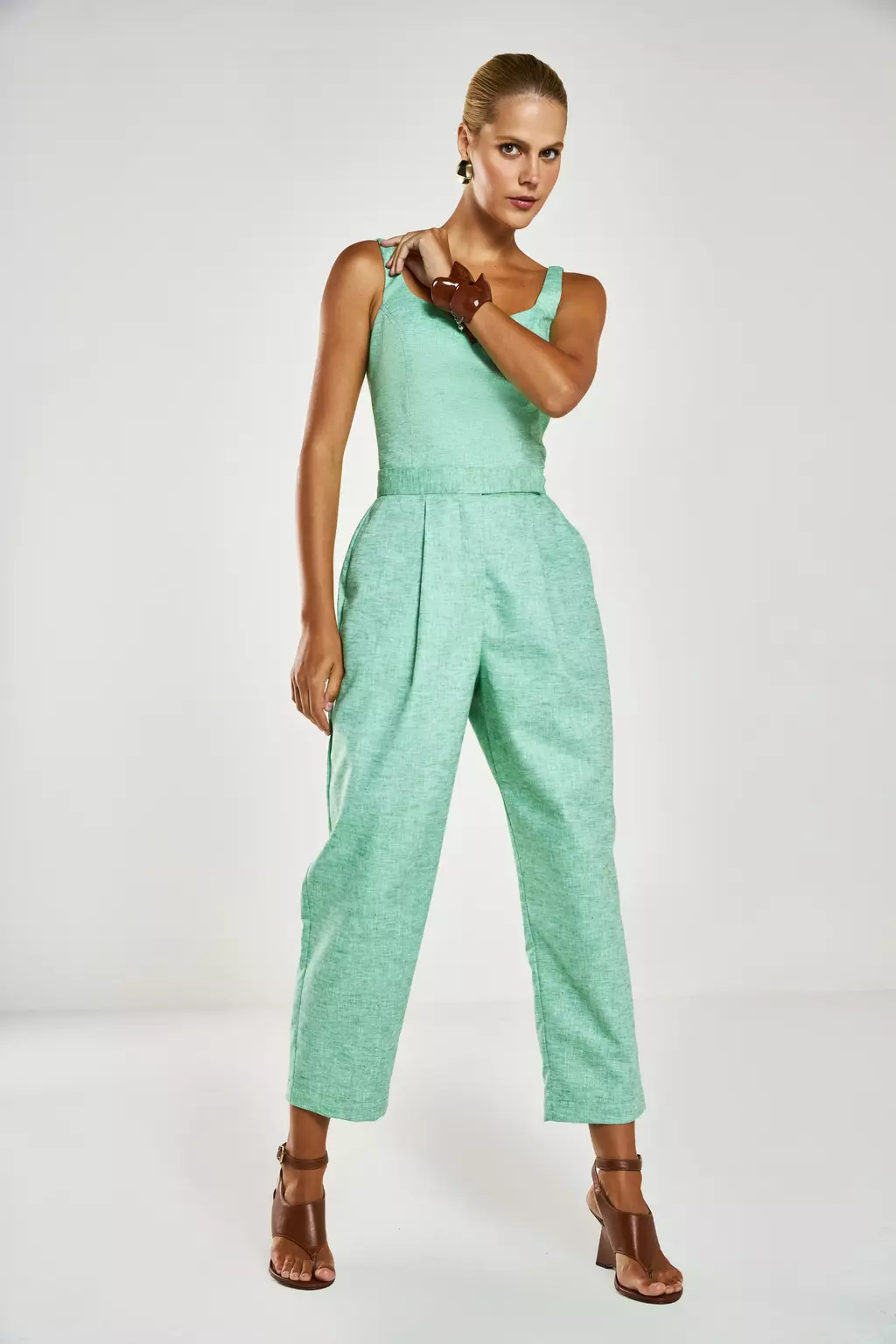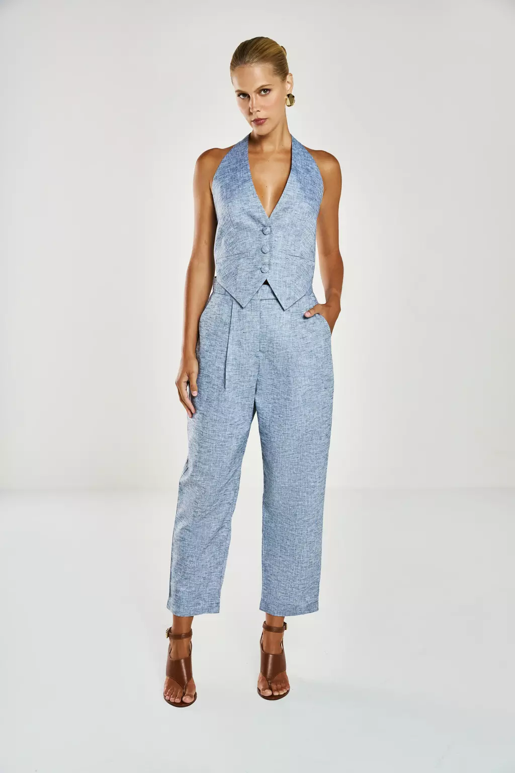 Confeccionada em Linen Canvas, a calça possui pregas frontais macho que garantem o caimento fluido e estruturado. O fechamento é embutido e limpo, com zíper, botão interno e colchete de alfaiataria. Os bolsos faca funcionais na frente e os bolsos traseiros decorativos mantêm a praticidade. O cós com acabamento em viés de algodão e a barra com vira dupla demonstram a qualidade e o cuidado nos detalhes.