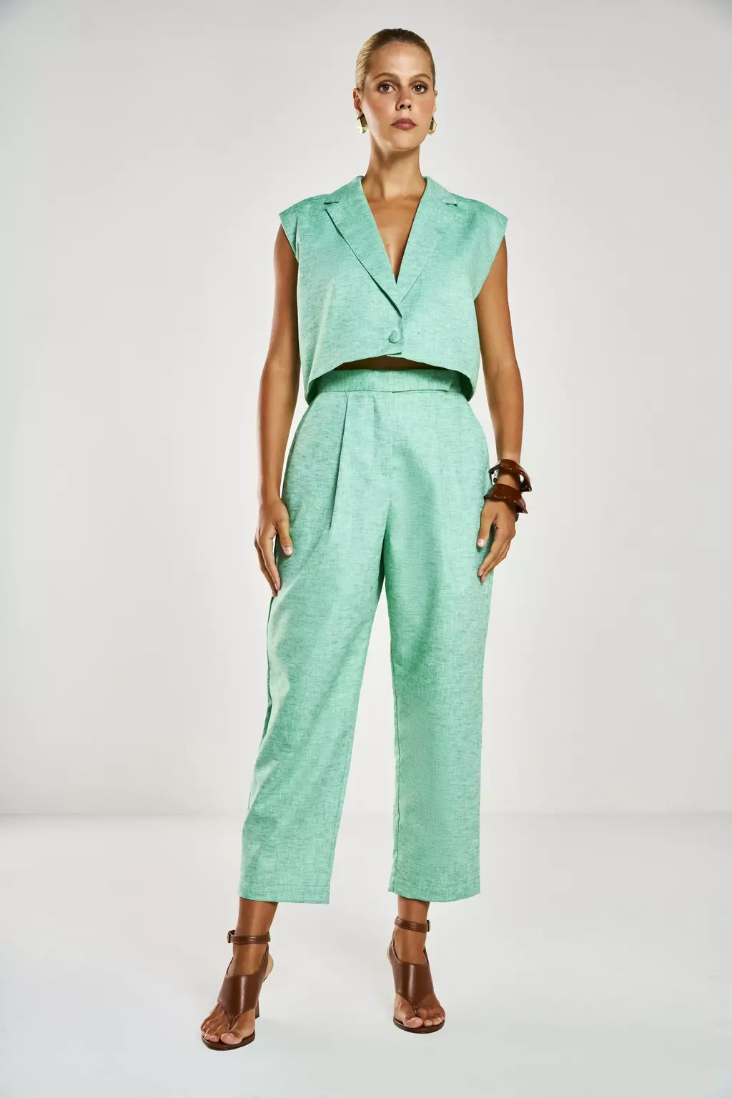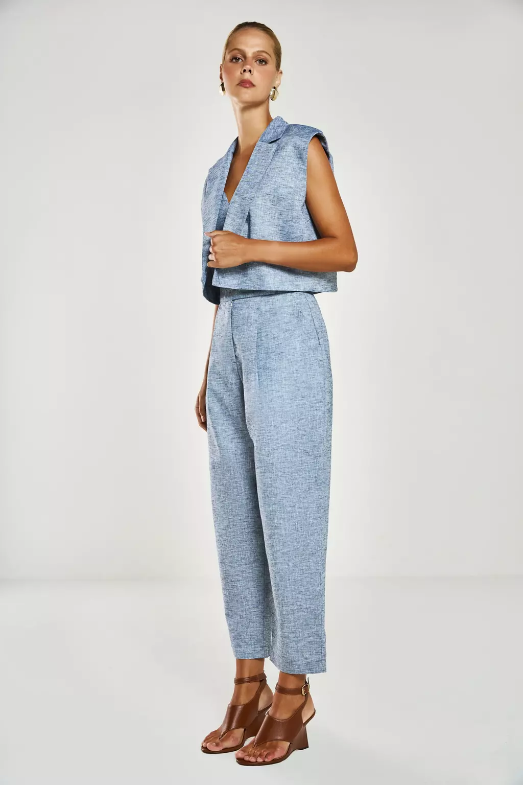 Calça Melina é a peça de alfaiataria que combina sofisticação e o caimento atemporal do corte reto. Com cós alto e estruturado com transpasse, ela define a cintura e desce em uma linha perfeitamente reta e ampla, garantindo um visual elegante do quadril até a barra. O comprimento cropped, na altura do tornozelo, destaca o calçado, dando um toque moderno à produção.