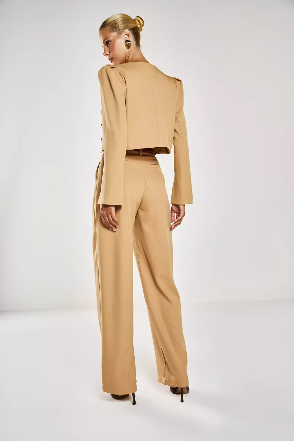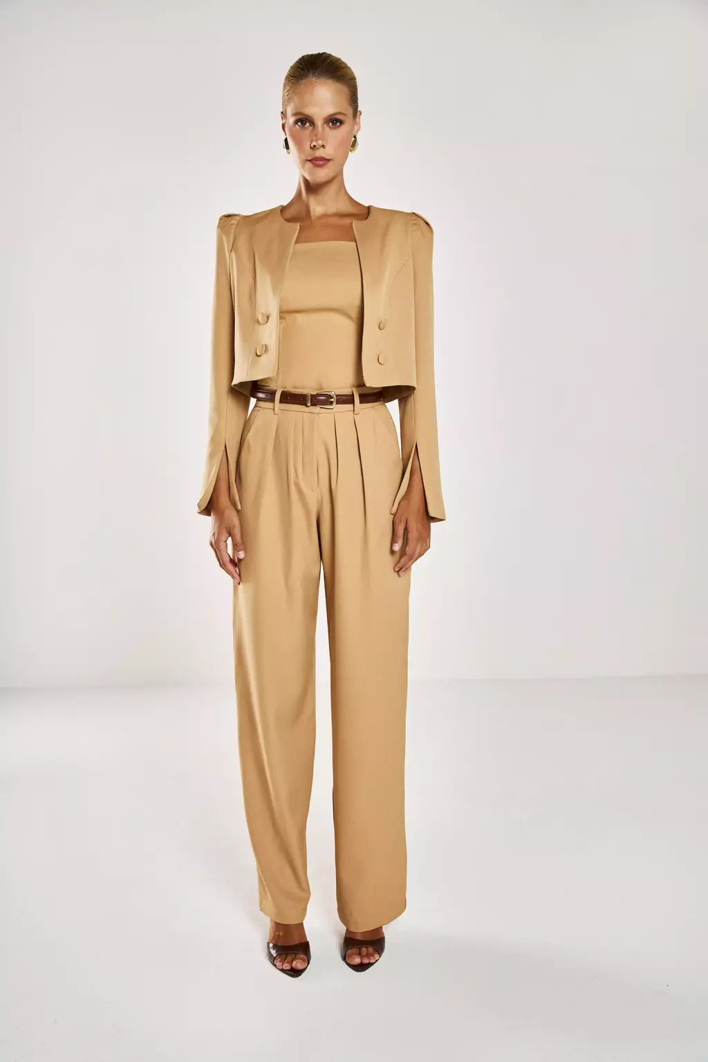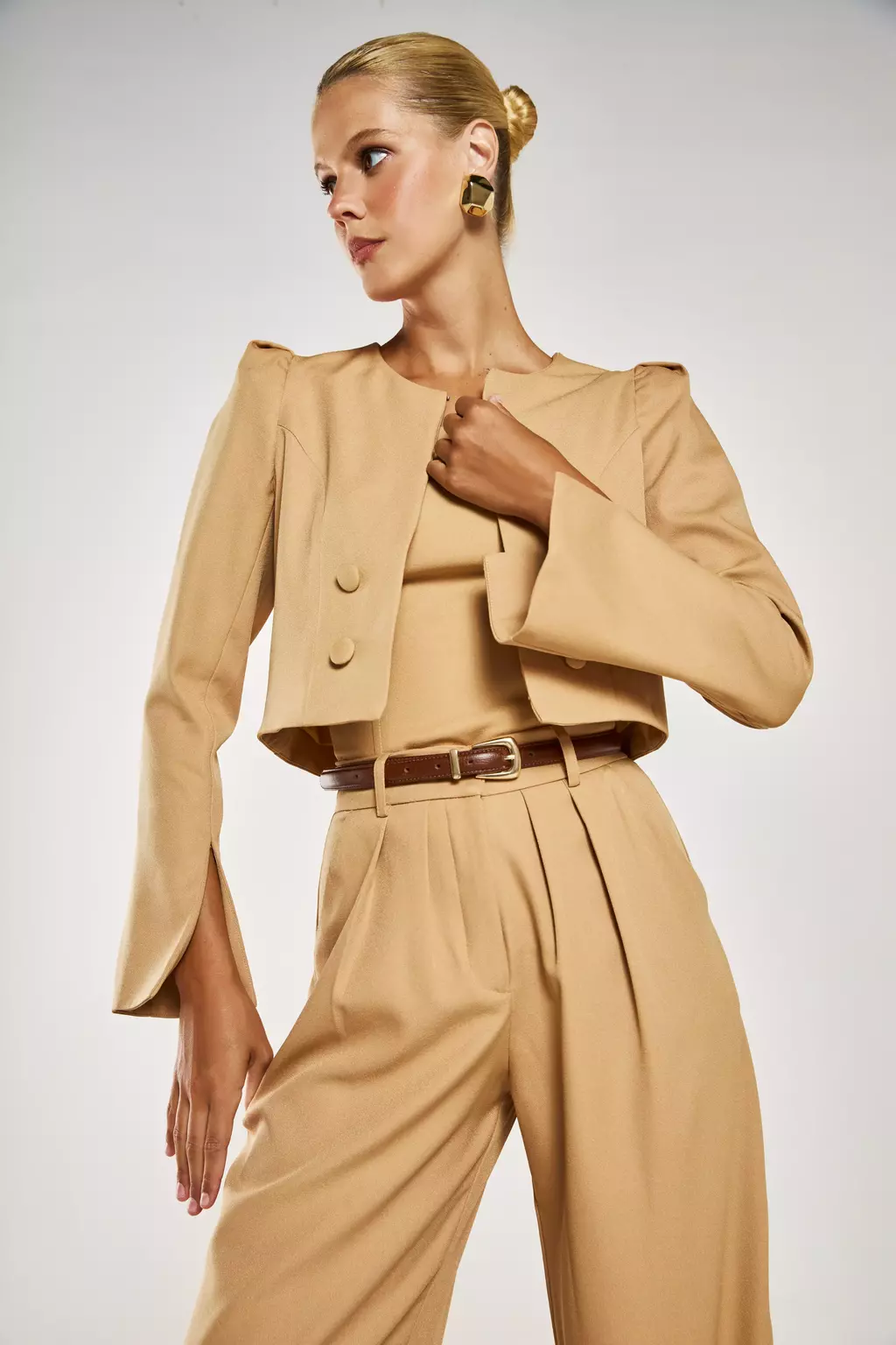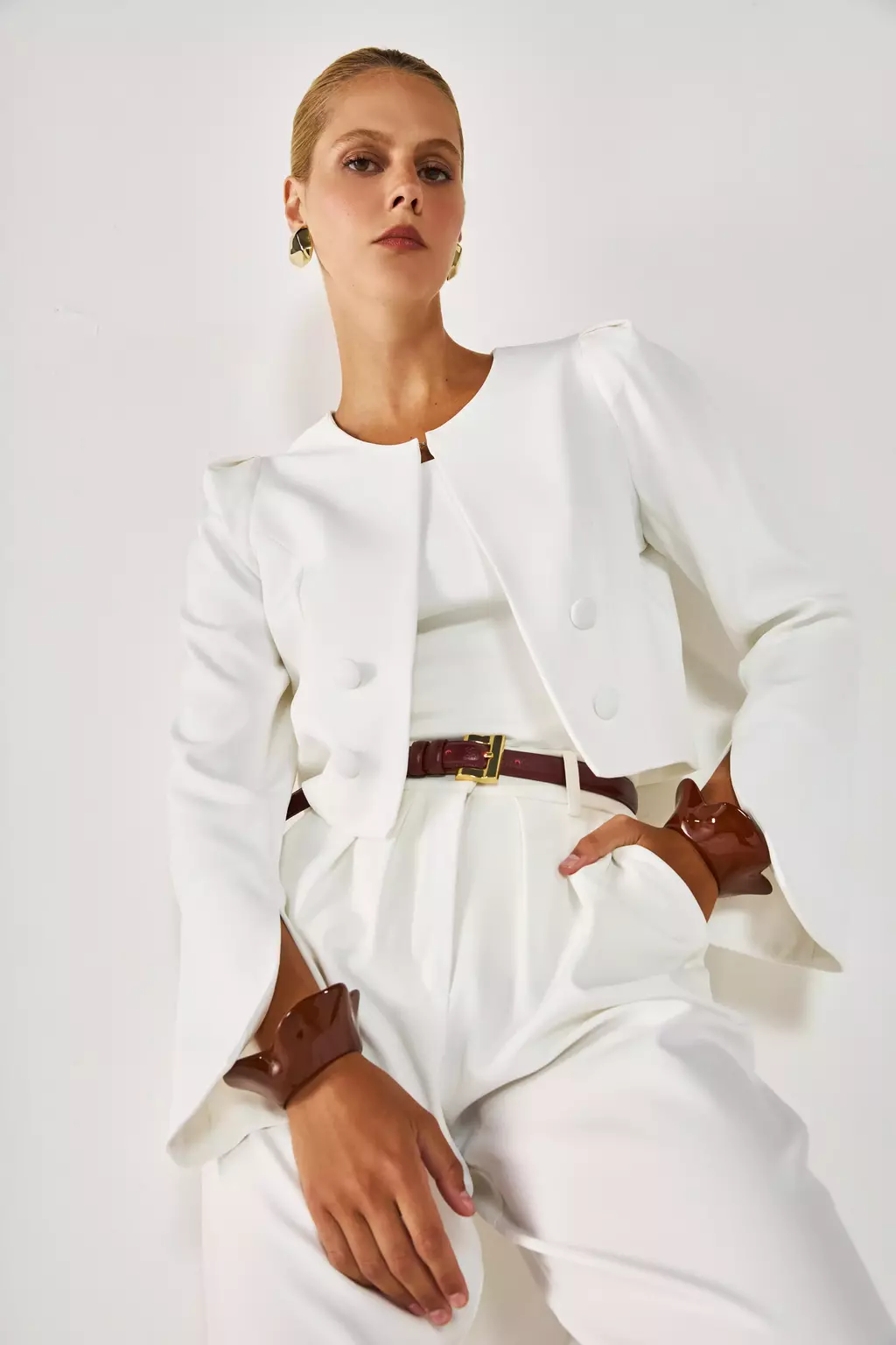Modelagem: Cropped estruturado, mangas longas ajustadas.