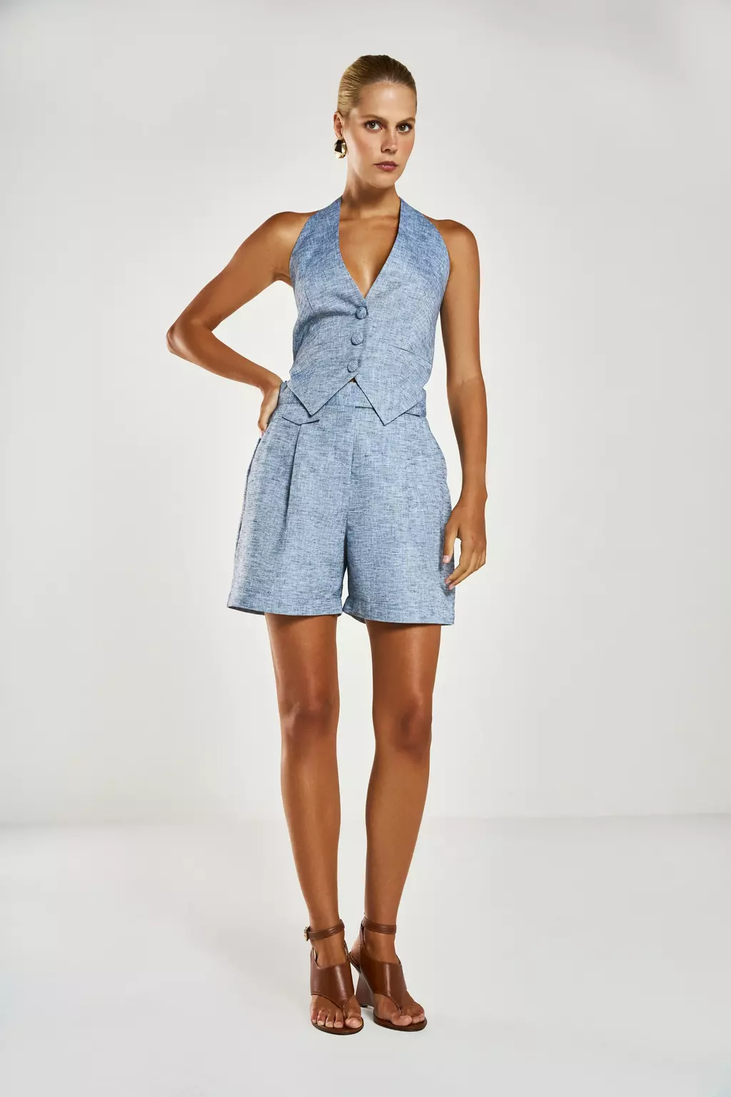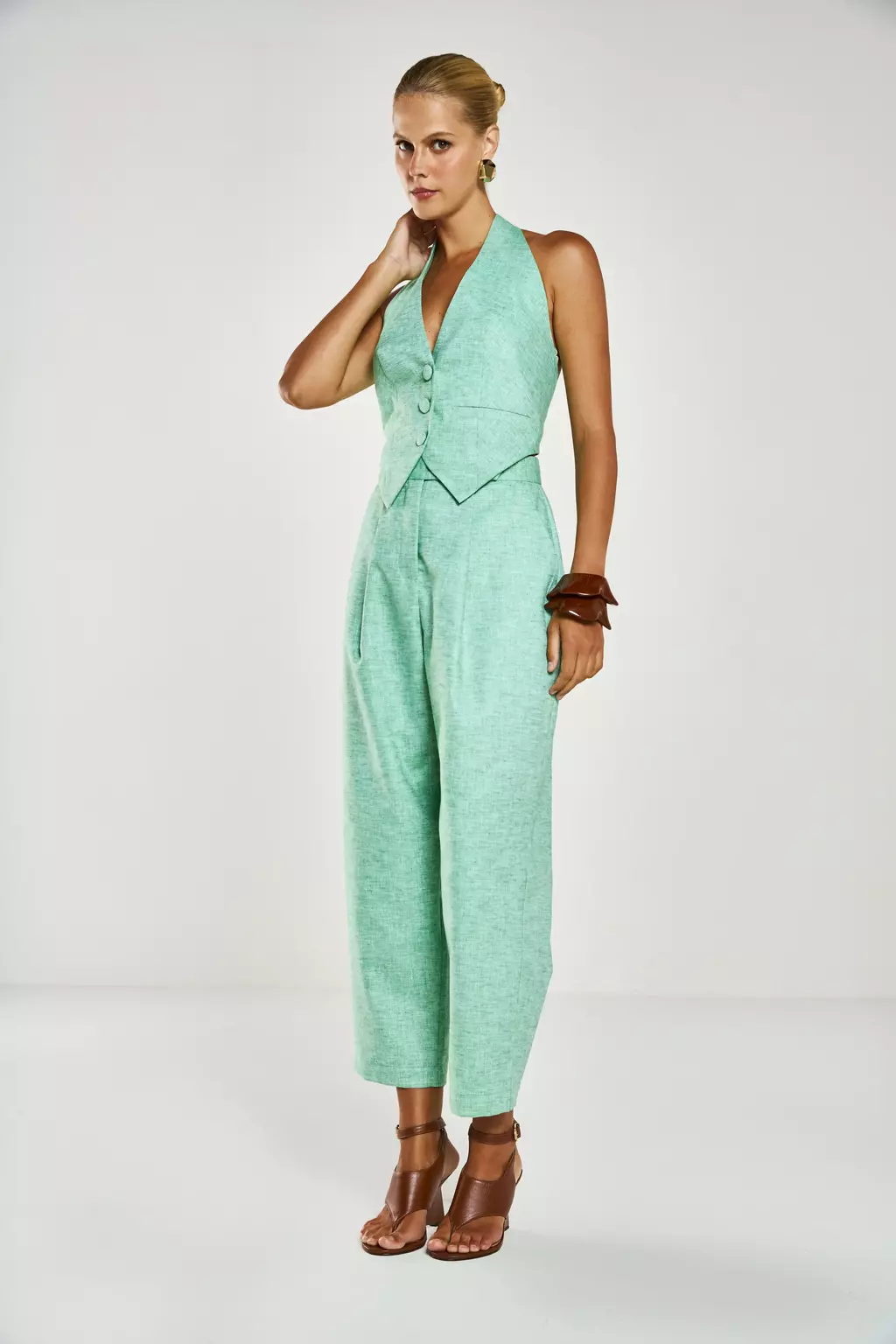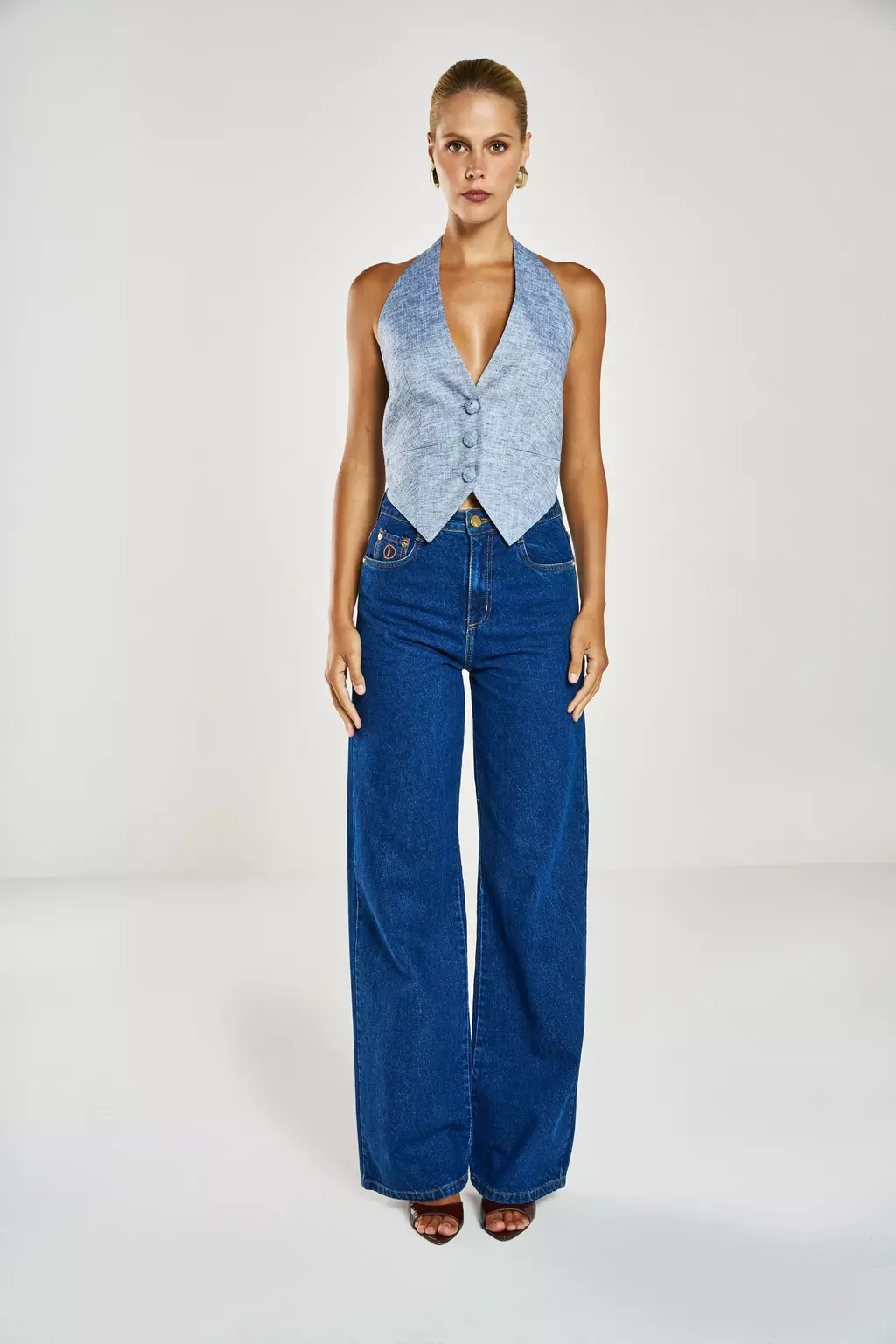O Colete Lana é a definição de estilo e sensualidade com seu design frente única. Com silhueta ajustada e acinturada, esta peça cria um visual elegante e marcante. O decote V profundo e abaulado na frente se estende para uma gola que é amarrada na nuca, garantindo um ajuste perfeito e valorizando o colo.