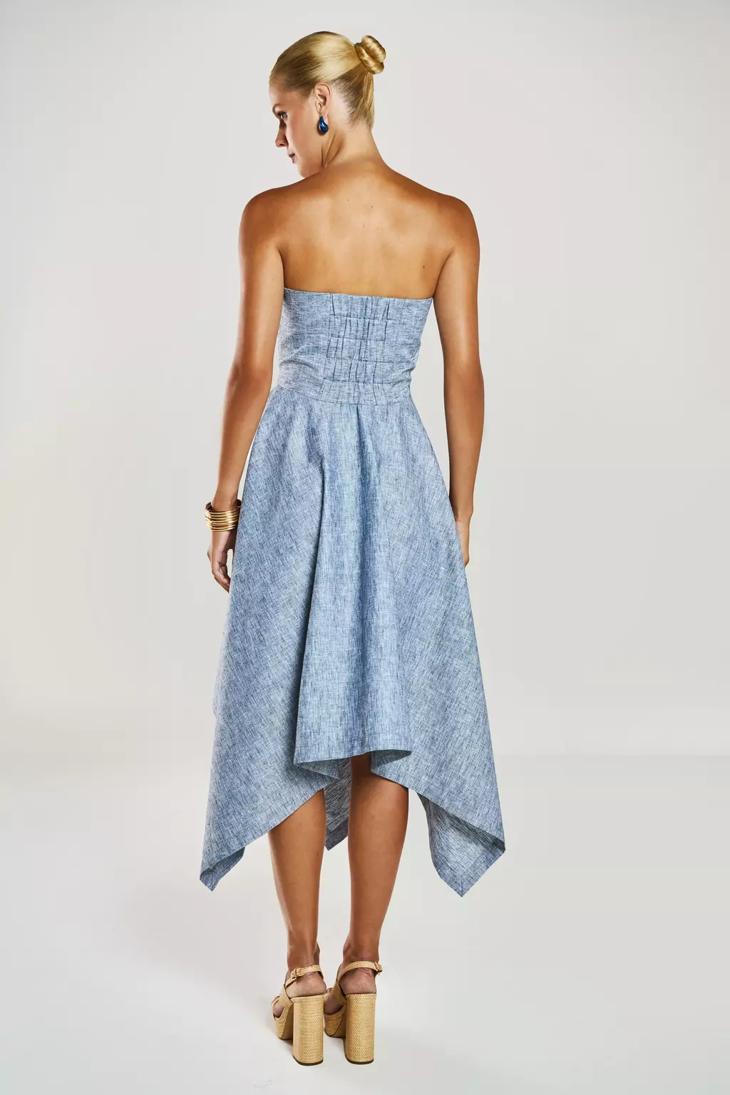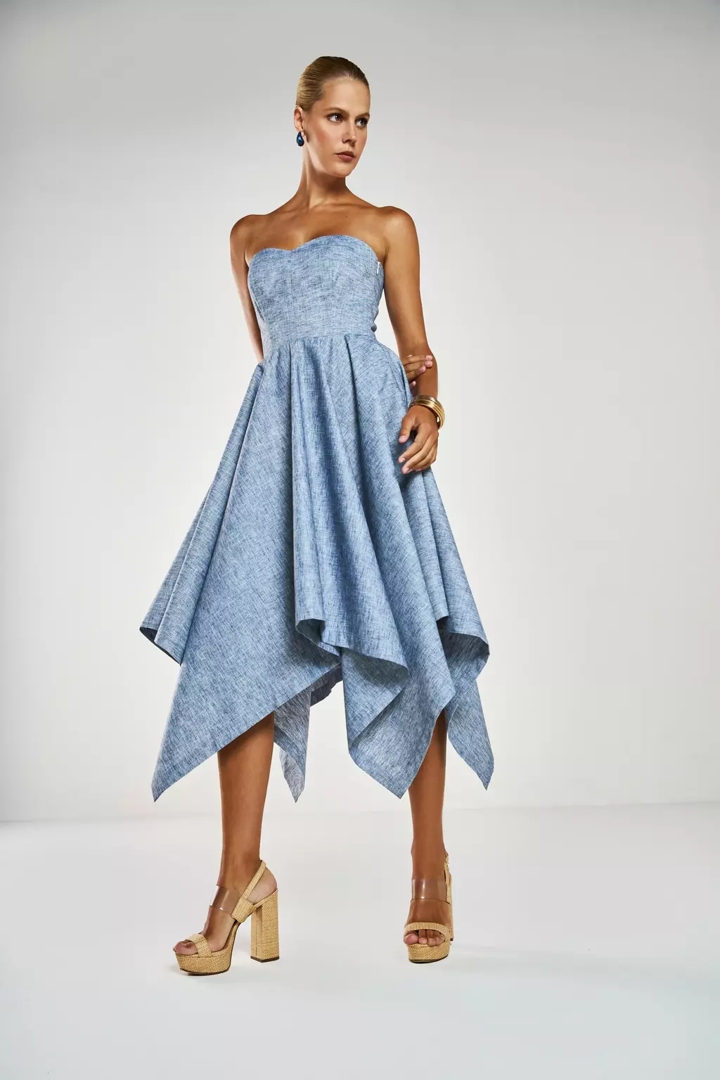 Modelagem: Midi, tomara que caia com saia rodada assimétrica.
