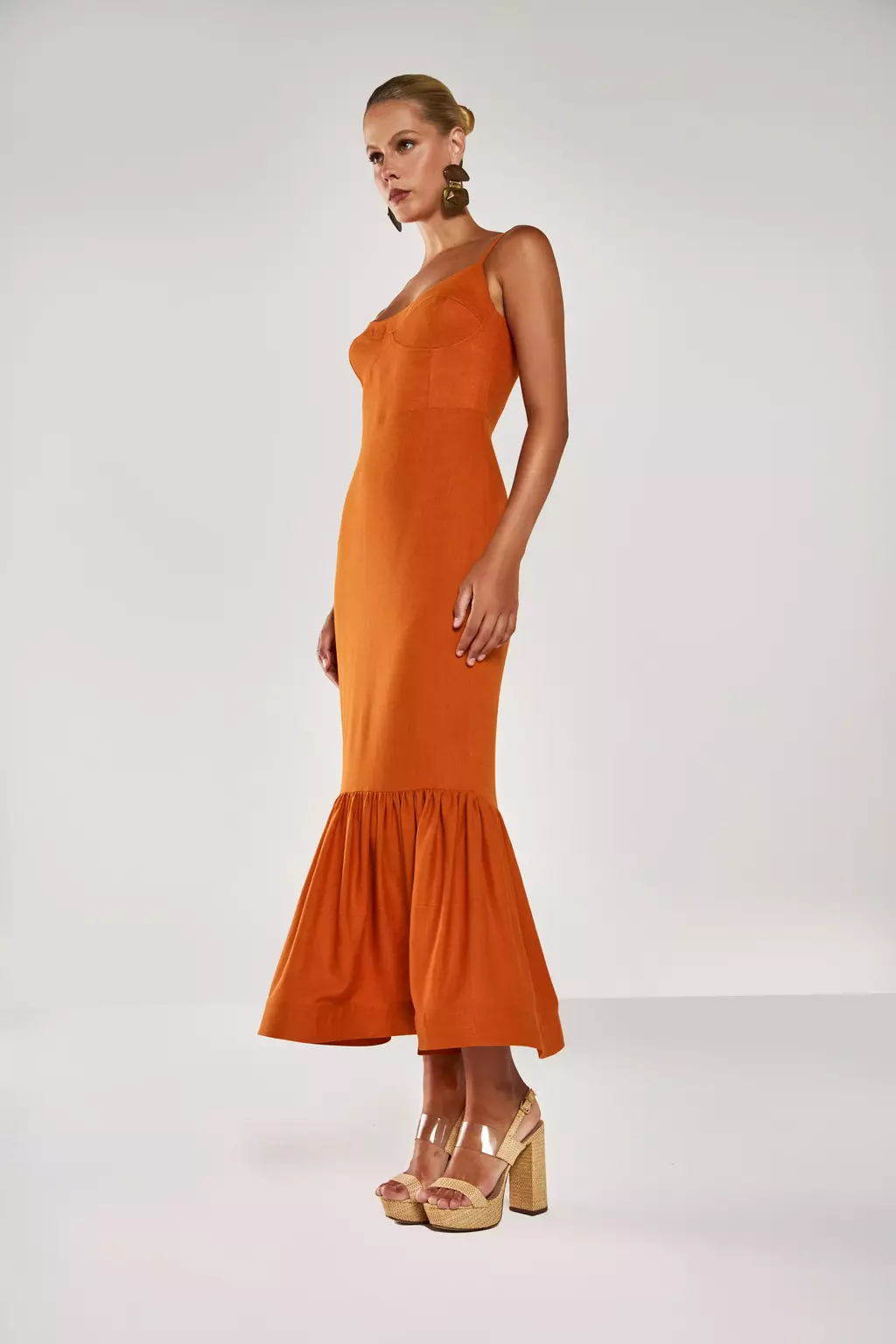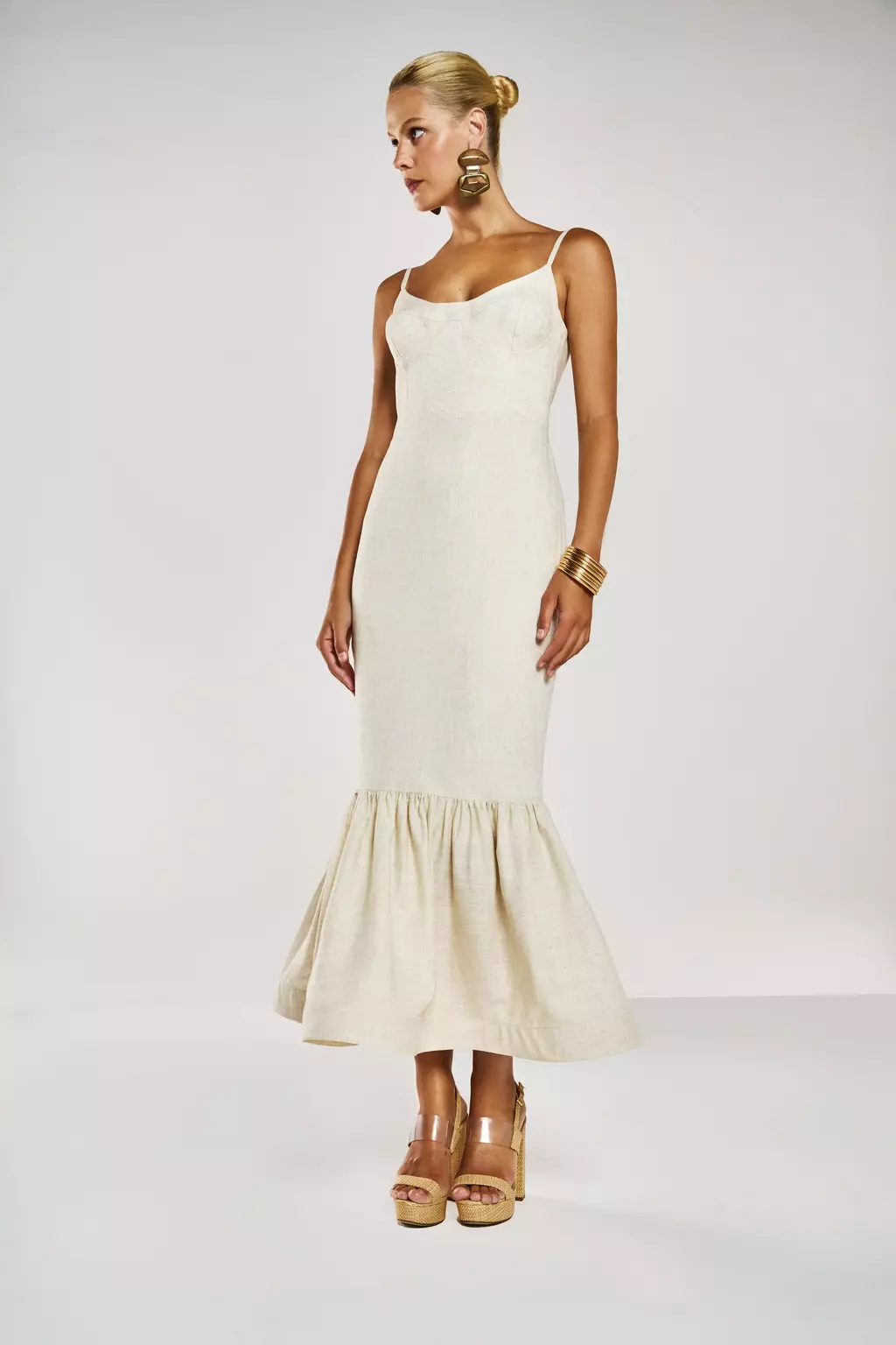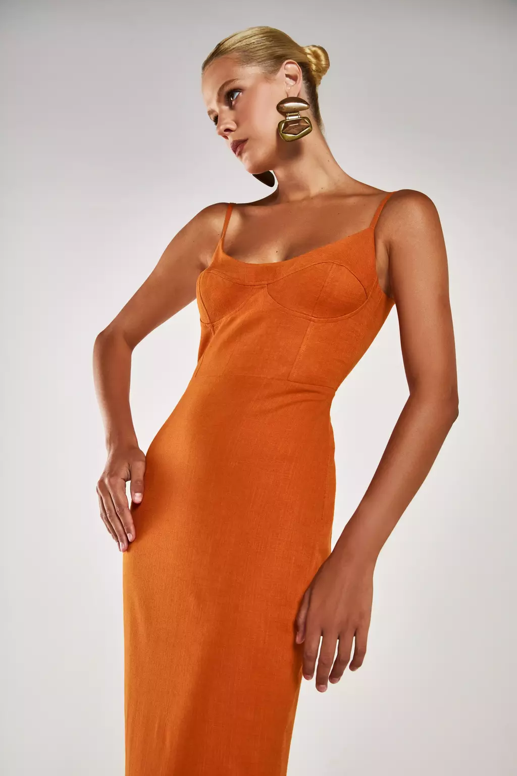 O Vestido Cris é a peça que une a sensualidade e o romantismo em um design único e impactante. Com silhueta sereia midi e alças finas reguláveis, ele se ajusta perfeitamente ao corpo, realçando as curvas com elegância. Os recortes estratégicos e estruturais no busto e na lateral do corpo garantem um caimento impecável e suporte ideal.