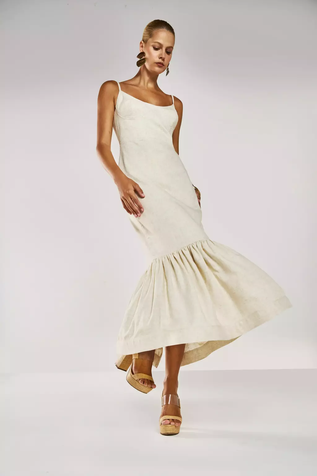 O grande diferencial da peça é o babado amplo e franzido na parte inferior da saia, com crinol embutido que cria uma ondulação firme e dramática. Além disso, o acabamento impecável com costuras embutidas e costura francesa nas laterais, junto com o zíper invisível no centro das costas, garante um visual limpo e sofisticado. O Vestido Cris é a escolha ideal para eventos e ocasiões especiais, onde você quer se destacar com delicadeza e poder.