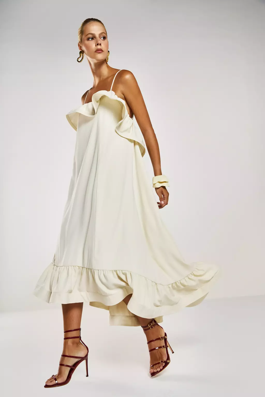 O visual impactante fica por conta da barra larga e ondulante, composta por um babado grande com crinol embutido, que proporciona um movimento único e dramático. Os babados aplicados no recorte das costas complementam o design, enquanto os acabamentos em costura francesa e o forro completo garantem conforto, durabilidade e alta qualidade. O Vestido Rebeca é a escolha ideal para criar looks inesquecíveis e cheios de personalidade.