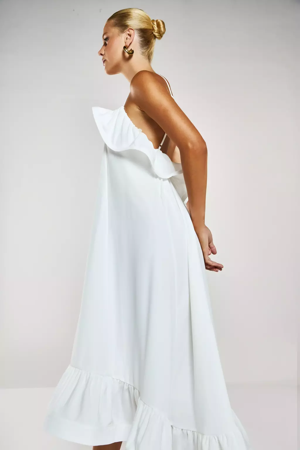 Modelagem: Vestido longo fluido, com comprimento frontal mais curto.